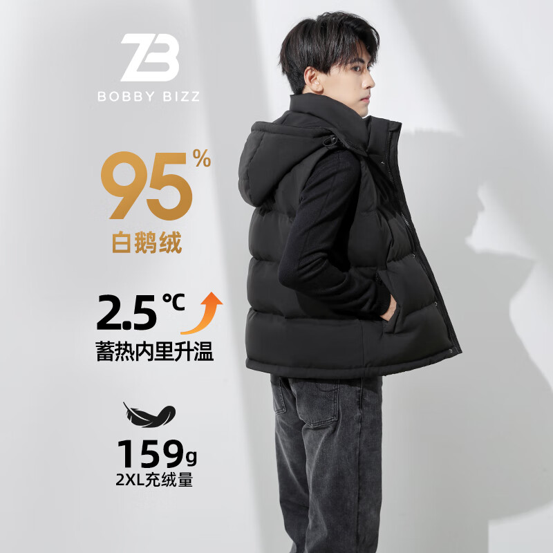 BOBBY BIZZ男士羽绒服马甲秋冬季2024新款背心95%白鹅绒马夹加厚保暖外套潮 黑色 2XL 175斤左右
