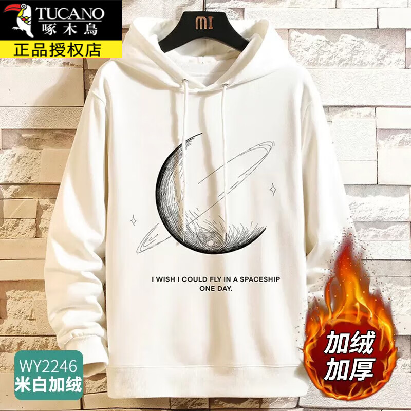 百亿补贴:啄木鸟连帽卫衣男春秋款潮牌宽松休闲套头上衣服帅气印花青少年秋冬外套 米色加绒 2XL 建议155-170斤