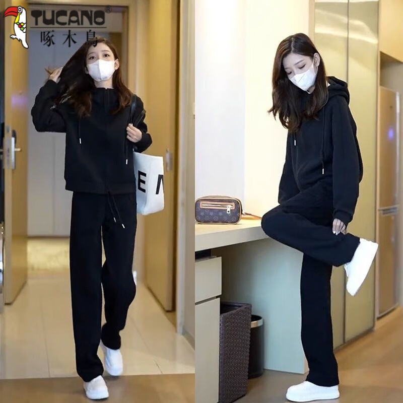 啄木鸟运动服套装2025春季宽松新款显瘦时尚减龄开衫棉卫衣休闲两件套 黑色【原版两件套】 3XL 135-150斤