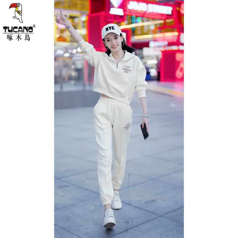 啄木鸟小个子时尚纯棉卫衣女休闲套装春秋季新款洋气上衣运动炸街一整套 杏色套装【上衣+裤子】 M 建议80-100斤