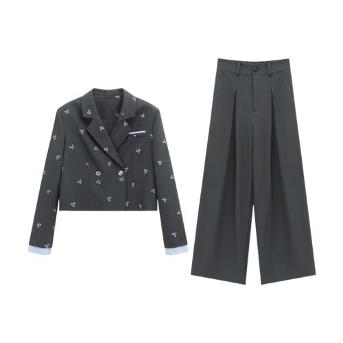 灰色 S(85-100斤) Basic House/百家好气质通勤刺绣短款西装外套阔腿裤女时尚套装