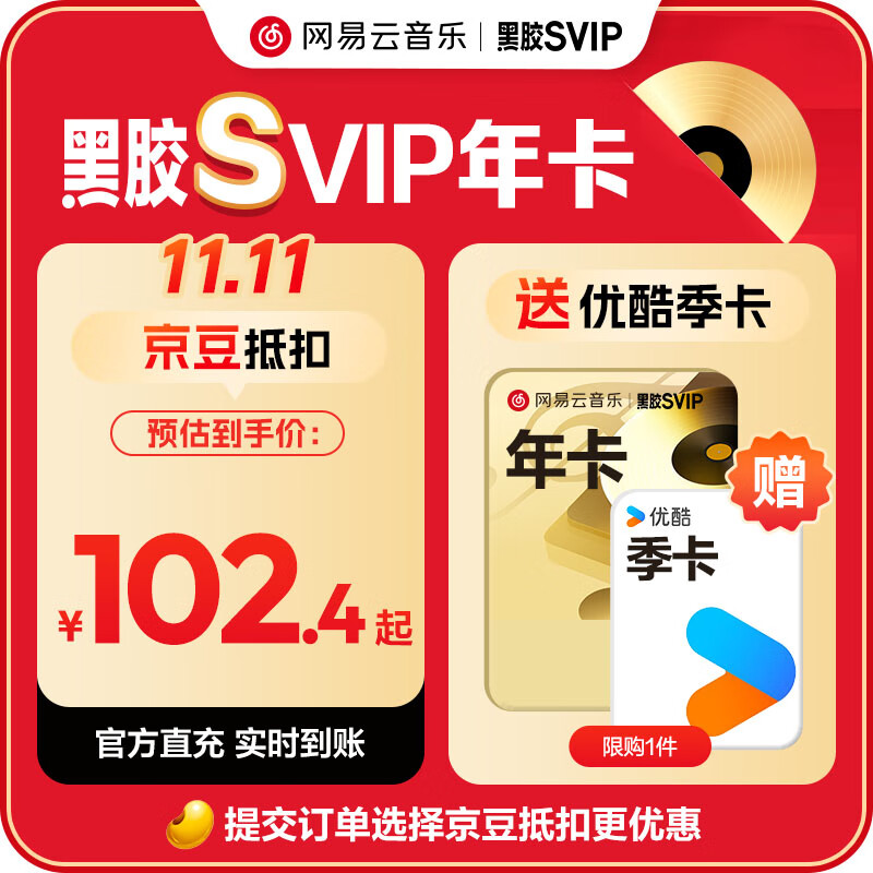 【赠优酷会员季卡】网易云音乐黑胶SVIP年卡旗舰店直充立即到账手机号充值