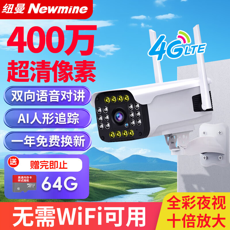 纽曼4G无线家用摄像头无需连WiFi手机远程监控器360度无死角带夜视全景农村室外户外防水可对话需充值