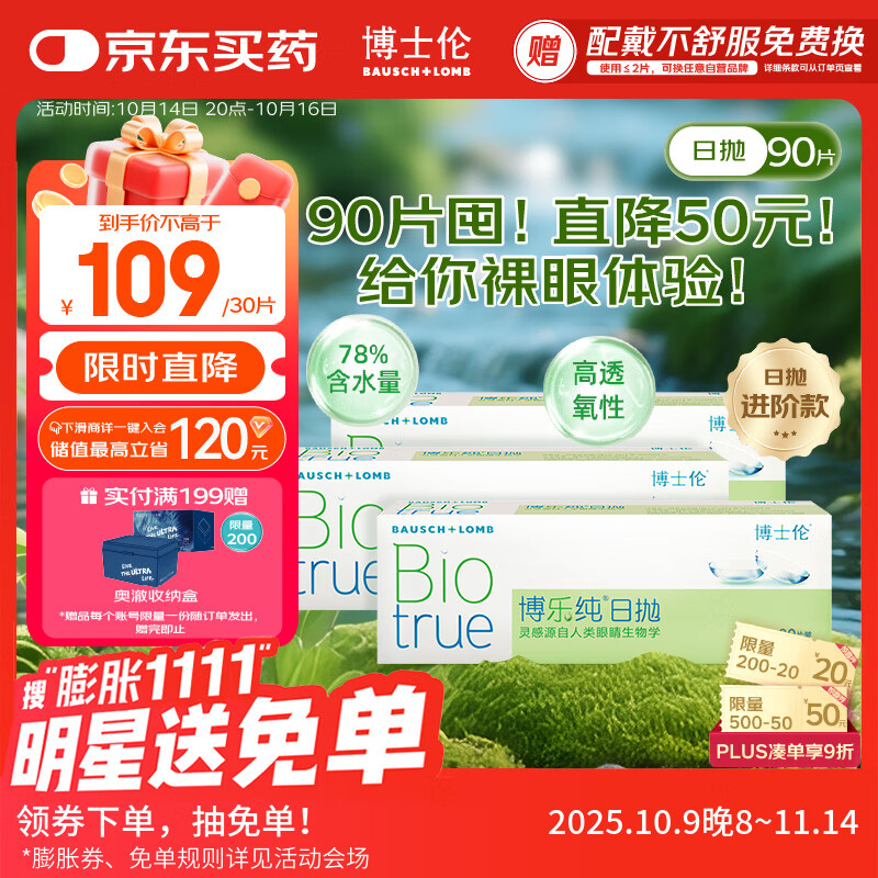 博士伦博乐纯透明隐形眼镜日抛90片囤货装裸眼般水润舒适150度