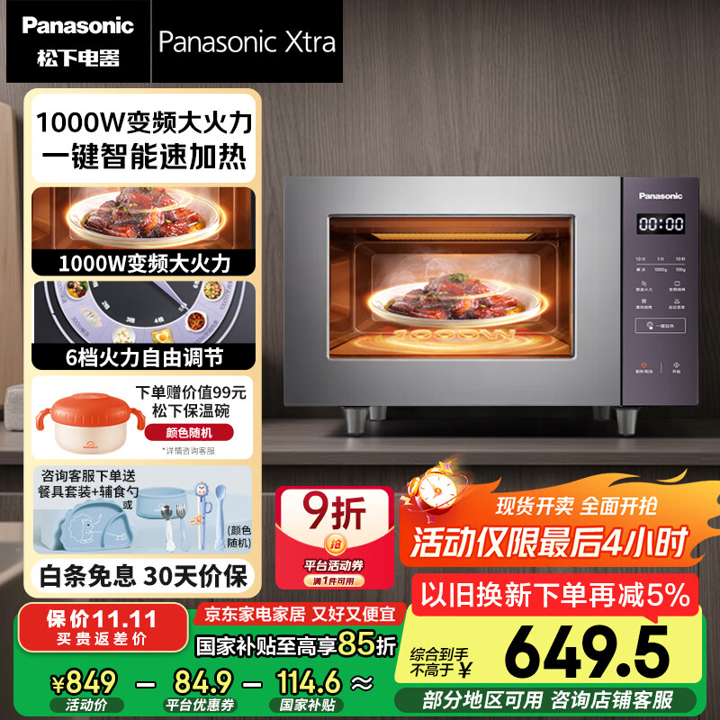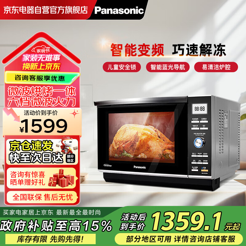 松下(Panasonic)微波炉家用27升平板/6段火力/变频/菜单/加热均匀/清洁/不锈钢炉腔烤箱微烤一体机 NN-GF599MXUE