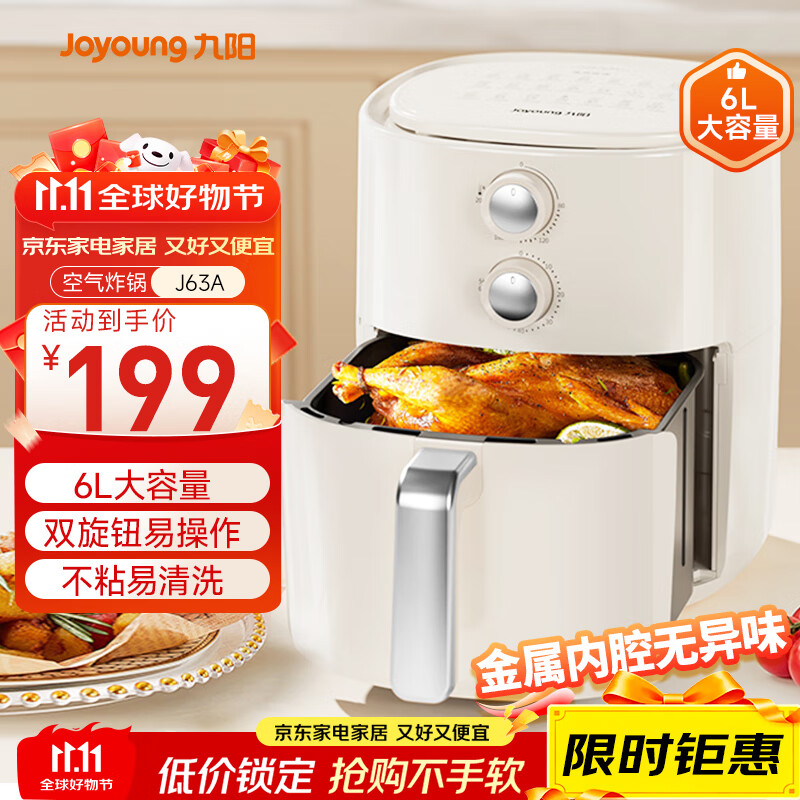 九阳(Joyoung)6L大容量空气炸锅家用 准确定时无油低脂煎炸 烘炸烤多功能蒸烤一体机烤箱薯条机空气炸锅 KL-J63A