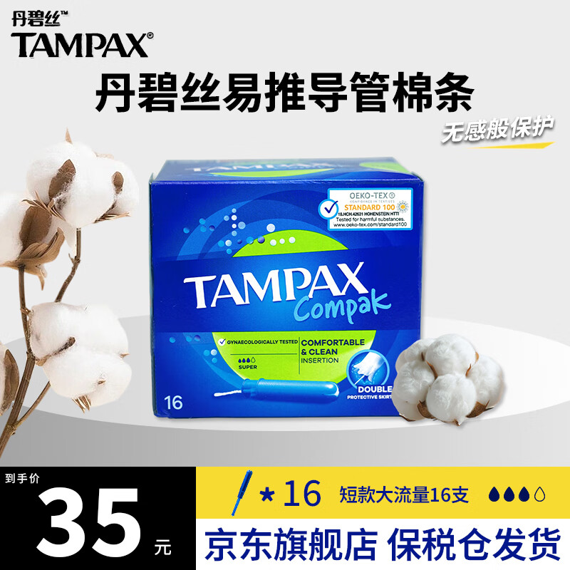 丹碧丝(TAMPAX)进口卫生棉条导管式无感内置棉棒卫生姨妈巾长导管短导管卫生棉条 【大流量】 16根 1盒 短款