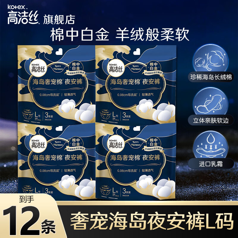 高洁丝(Kotex)裤型卫生巾夜安裤贴体防漏经典蜜桃小姐安睡裤安心裤经典款蚕丝感 L 12条 80-110斤 (海岛棉夜安裤) (推荐体重)