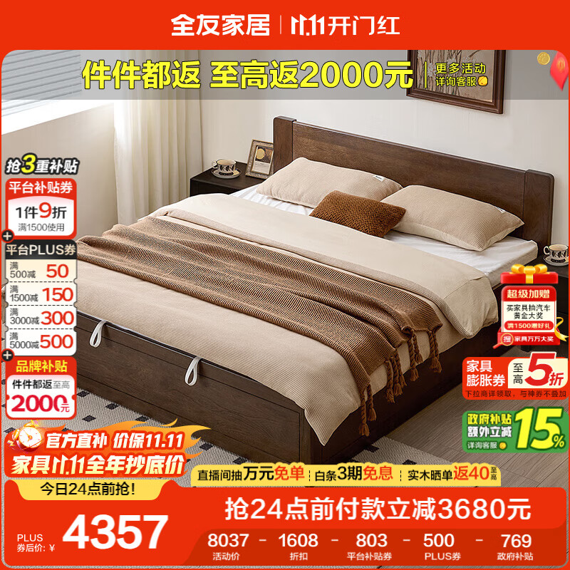 全友家居 北欧原木风实木橡木床卧室家用1.5x2米高箱储物收纳双人大床