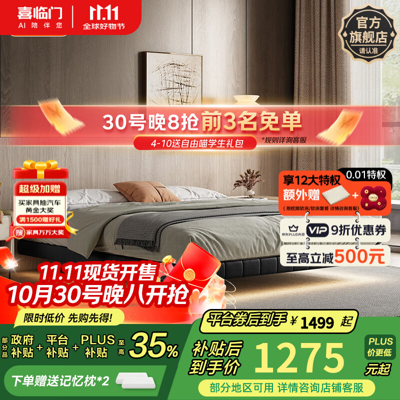 喜临门悬浮床主卧双人床真皮简约实木排骨架无床头仙女床[床架] 无床头-星辰黑+灯带 1.5*2米