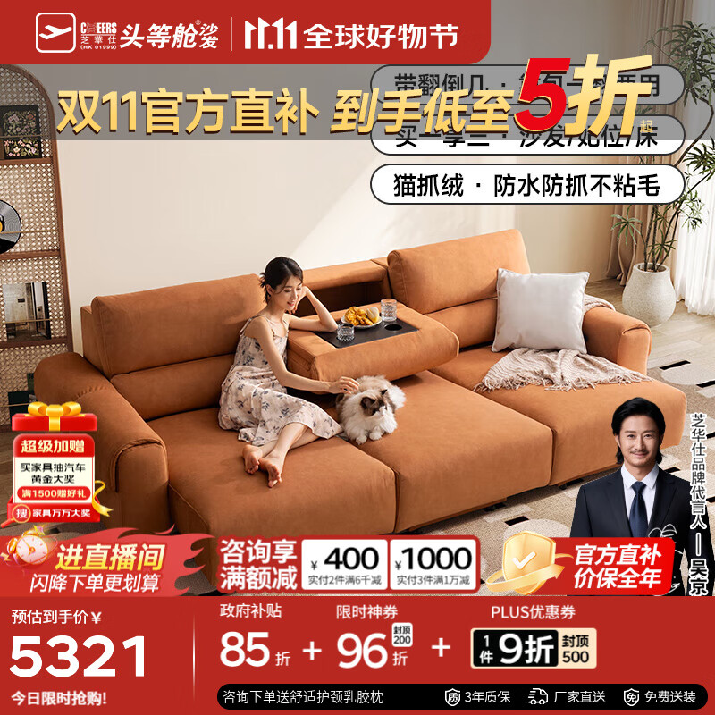 芝华仕头等舱时尚智能椅布艺沙发床客厅电动功能零靠墙家具芝华士30335C 姜饼棕-沙发床三电-2.96M+翻到几-猫抓绒 优先发货(详询客服)