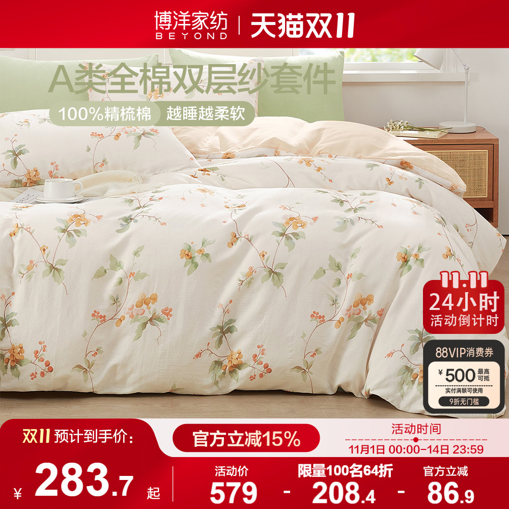 聚划算:博洋纯棉纱布四件套双层纱A类被套床单被罩床上用品三件套床品