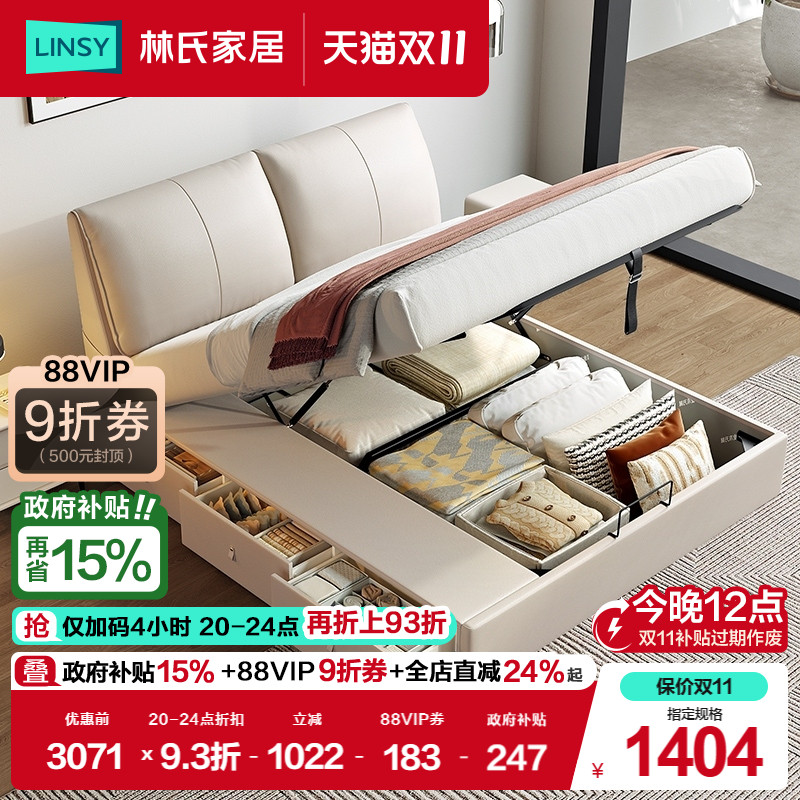 聚划算:林氏家居意式真皮床主卧大床软包靠背储物双人床大象耳朵新款家具