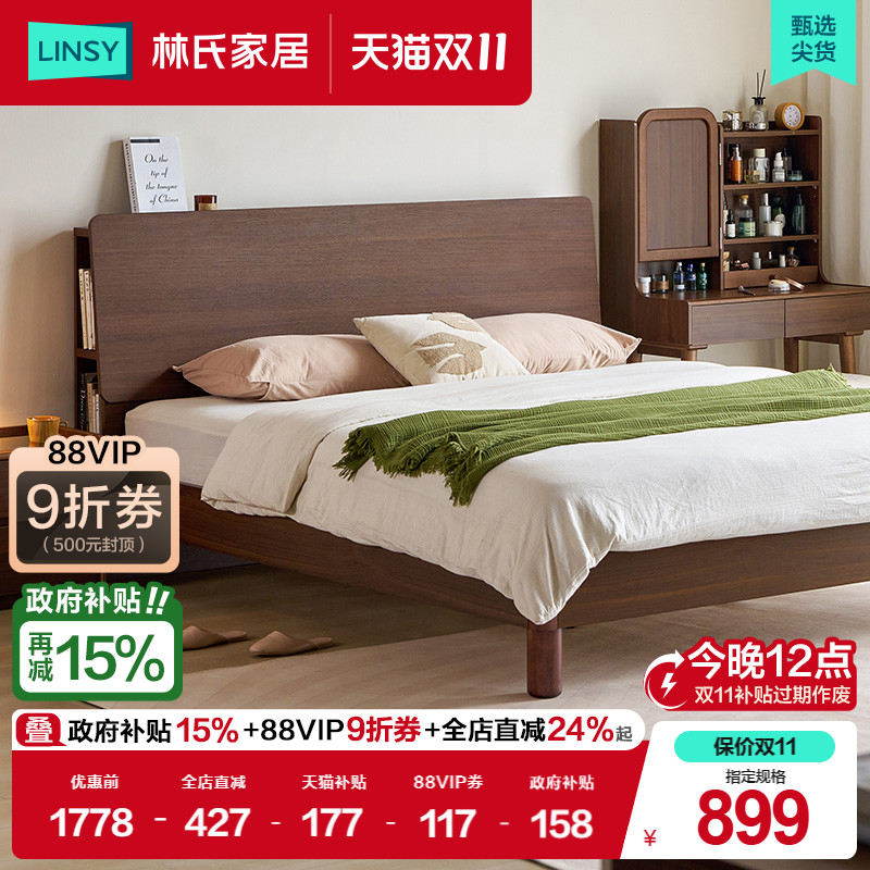 聚划算:(1)【橡木|胡桃色】多功能软包床 1500mm*2000mm 排骨架 林氏家居复古橡木实木床软包齐边