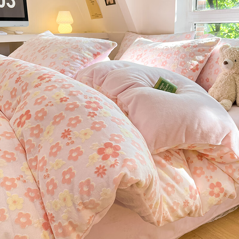 兰芮A类牛奶绒雕花保暖冬季四件套 漫花-粉 1.5/1.8m床 床单款 被套200*230cm