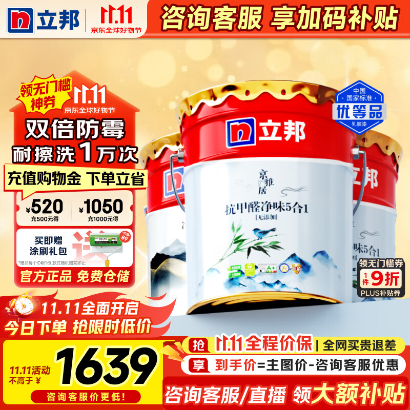 立邦乳胶漆油漆涂料内墙漆防霉抗甲醛五合一净味无添加环保室内漆 【抗甲醛防霉】54L套装(2面1底)