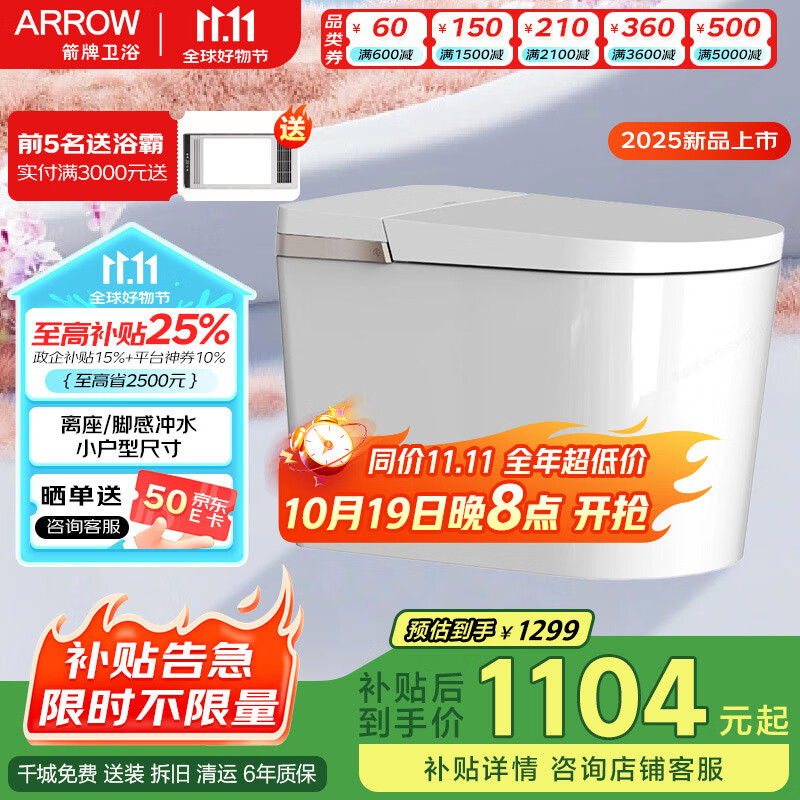 箭牌(ARROW)卫浴轻智能马桶脚感冲水自动一体式虹吸式智能坐便器以旧换新补贴 【小户型】轻智能脚感冲水Q22新 305/300mm
