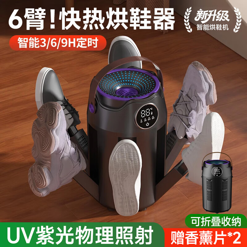 奥特优(AOTEYOU)烘鞋器干鞋器鞋子烘干机一体烘鞋机家用2025智能恒温烘鞋机烤鞋器烘干神器干湿两用烘鞋器 6臂烘鞋【高级黑】UV紫光丨3档定时丨赠香薰片丨 可伸缩 即烘即穿丨可折叠收纳丨360°循环烘干丨鞋靴均可烘