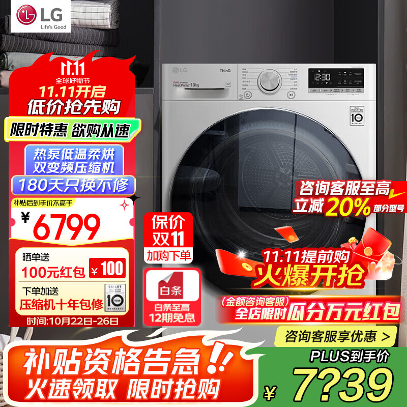 LG10KG热泵式烘干机智能双变频滚筒进口除菌除螨除潮冷凝器自清洁家用大容量低温柔烘双重绒毛过滤 RH10V3AV4W【10公斤烘干机线下同款】