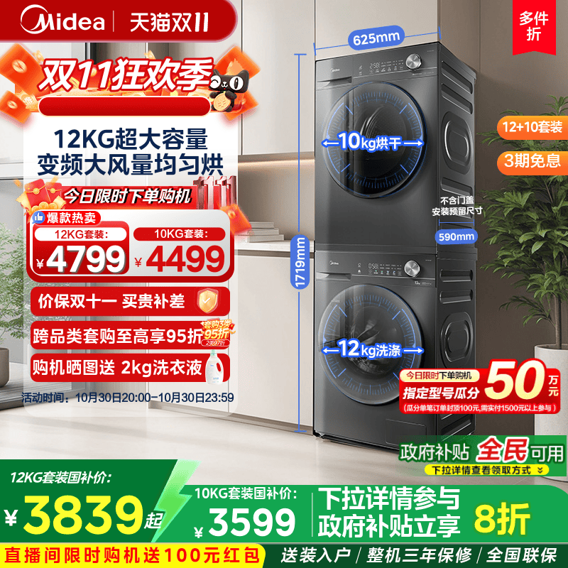 【全民补贴】美的洗烘套装12/10KG洗衣机变频热泵式烘干机36T