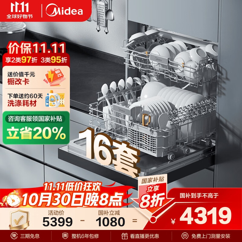 美的(Midea)【万向T7】嵌入式洗碗机灶下16套高700mm万向喷臂变频四星消毒105℃热风烘干168h存储