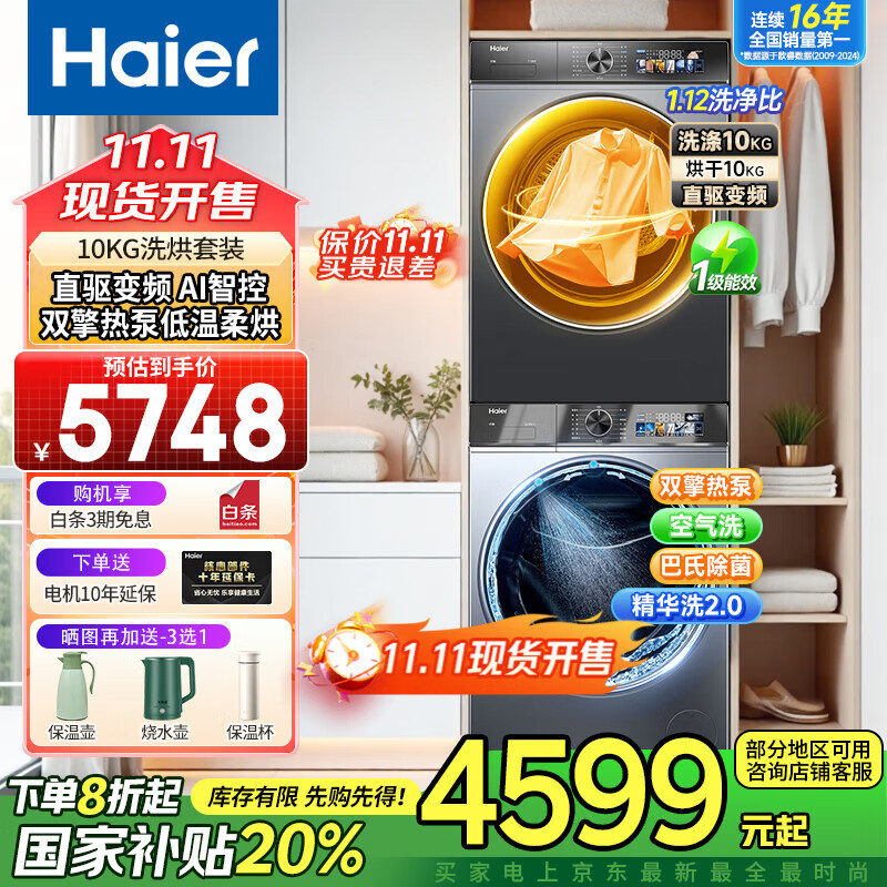 海尔云溪4.0【2025年新品】10公斤直驱全自动滚筒洗衣机精华洗+双擎热泵烘干机 洗烘一体套装家用大容量 【直驱|389套装】精华洗2.0+双擎热泵烘干