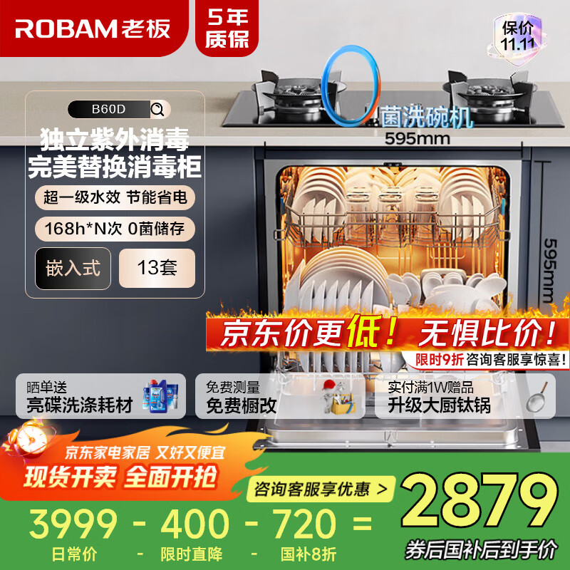 老板(Robam)【灶下独立紫外消毒】B60D13套0菌认证洗碗机嵌入式热风烘干168h长效存储一级水效快速洗国家补贴