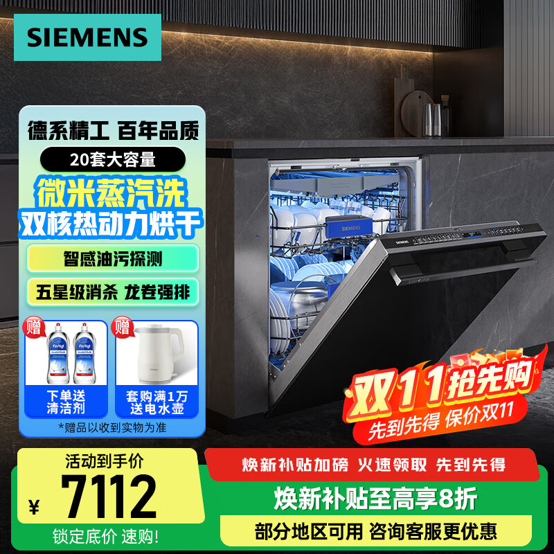 西门子(SIEMENS)嵌入式洗碗机20套大容量 微米蒸汽洗 双核热动力烘干 智感油污探测五星级消杀 龙卷强排SJ43HB66MC 新品上市