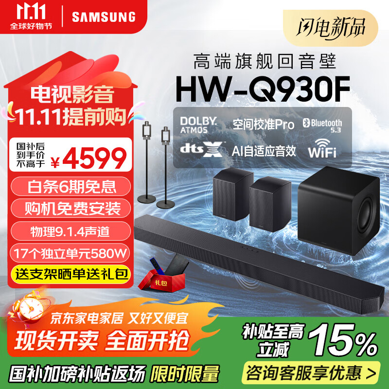三星(SAMSUNG)HW-Q930F/XZ杜比全景声 9.1.4声道DTS-X 回音壁 无线环绕低音炮 电视投影仪游戏音响 智能APP操控