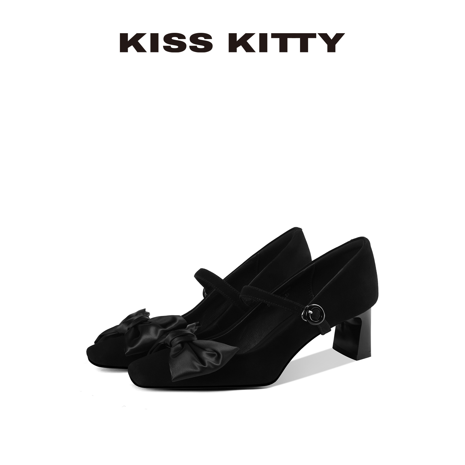 黑色 36 KISSKITTY玛丽珍女鞋2025新款羊反绒黑色粗跟方头蝴蝶结高跟单鞋
