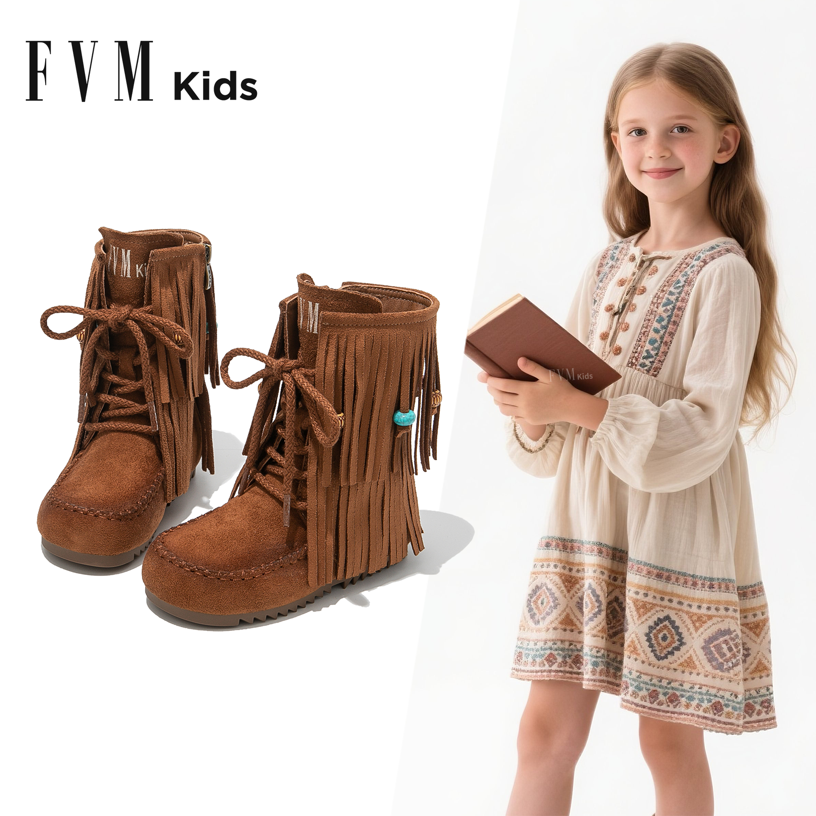 驼色 23码 复古流苏女童靴,马丁靴2025新款