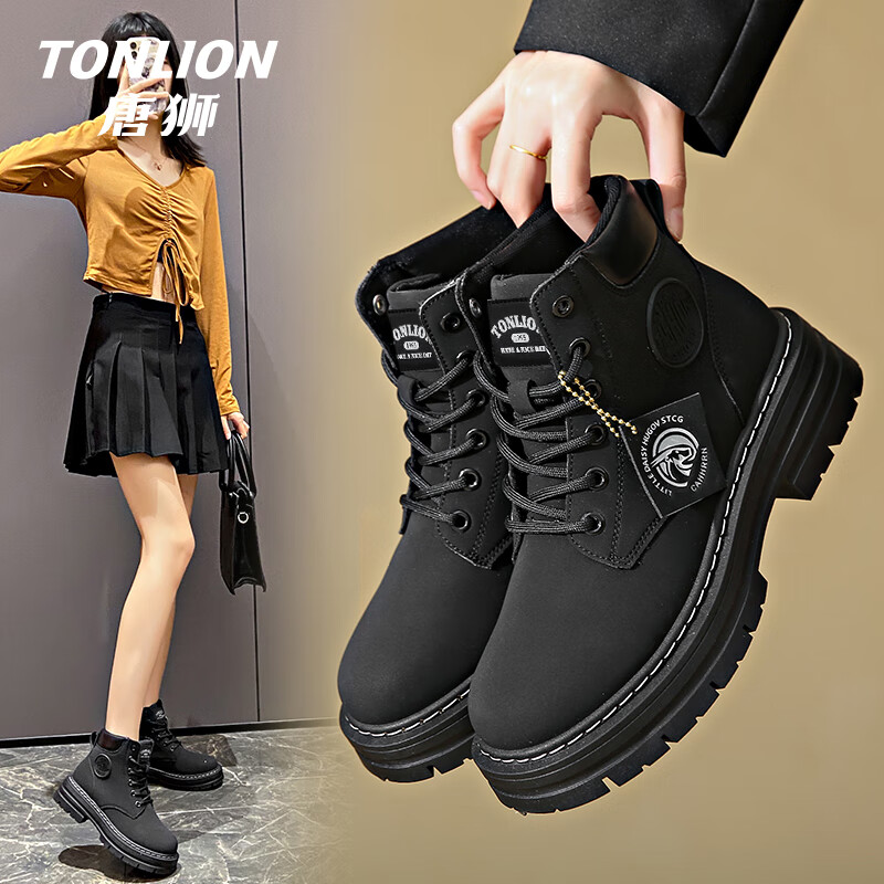 唐狮(TonLion)马丁靴女靴秋冬季英伦风大黄靴女士户外登山工装靴子女 黑色 38