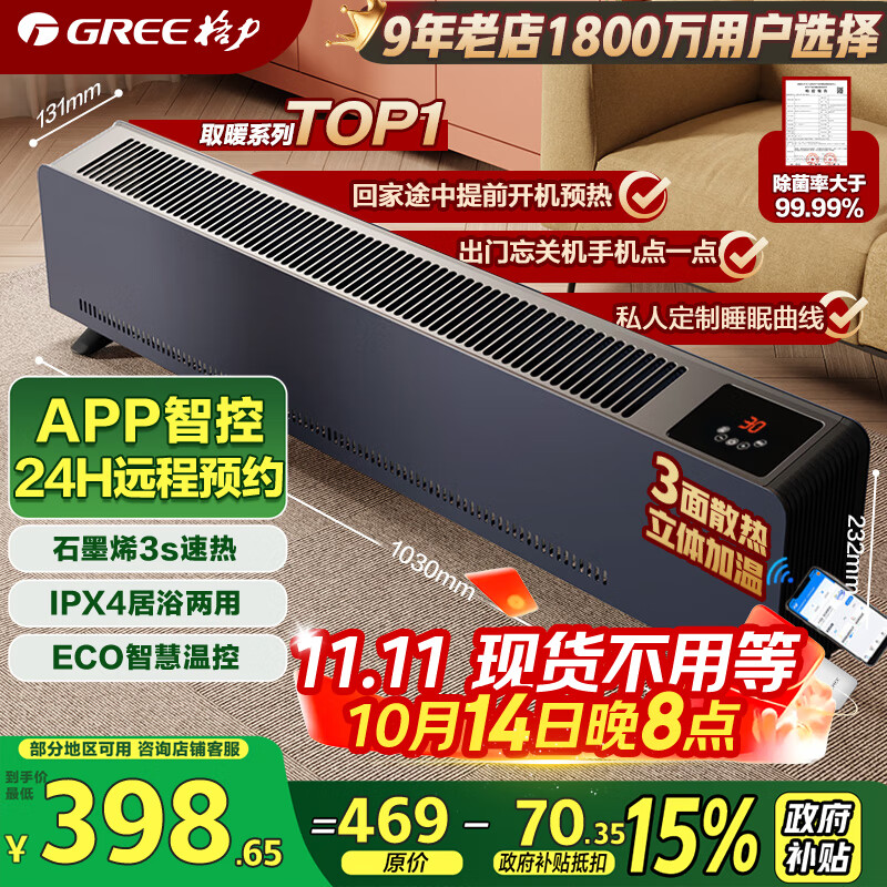 【政府补贴15%】格力石墨烯折叠踢脚线取暖器家用地暖浴室暖风机