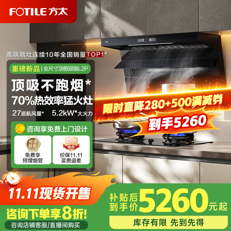 方太油烟机L2P烟灶套装全尺寸顶侧双吸抽油烟机家用27巡航风量大吸力7字型吸油烟机灶具套装L2P补贴20% 【套装享8折】搭5.2KW猛火灶TF29B