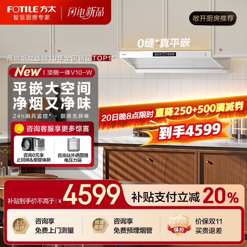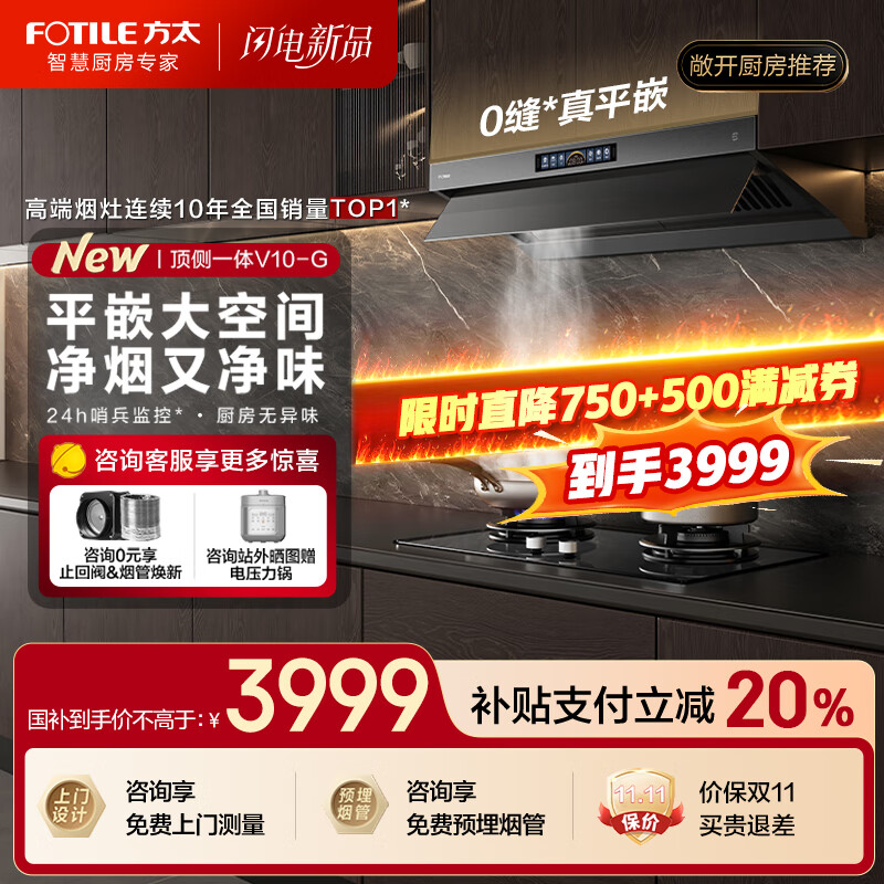 方太(FOTILE)抽吸油烟机灶具家用 顶侧一体平嵌28风量+升级70%热效率定时防干烧双功能灶 V1S-G+03-TEK20套装