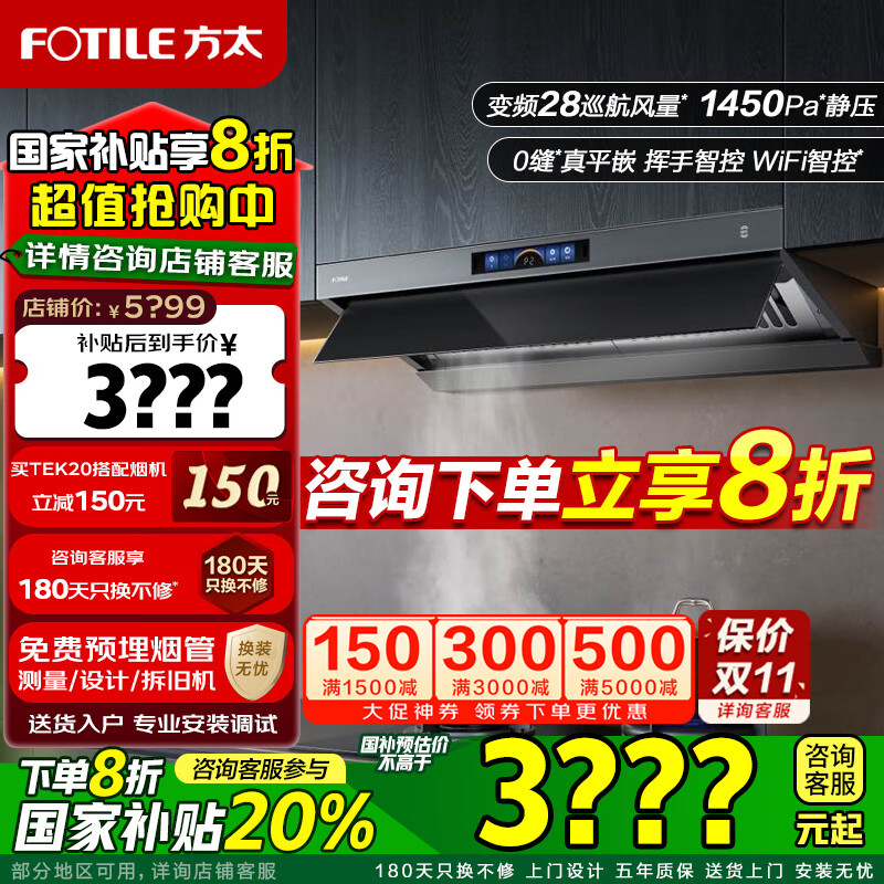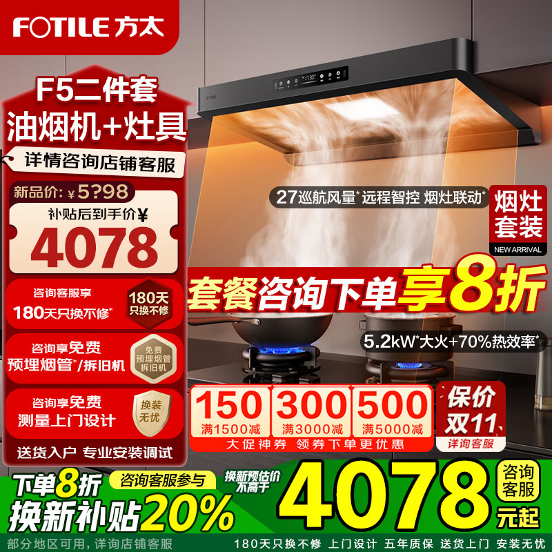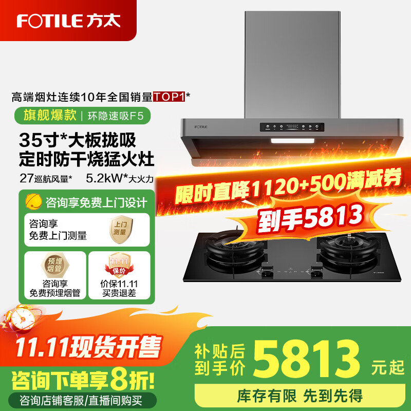 方太(FOTILE)新品F5油烟机27巡航风量窄缝纤薄抽吸油烟机灶具套装家用大吸力烟机环隐速吸挥手智控烟机燃气灶 【套装】F5+TF29B(非联动5.2火力)