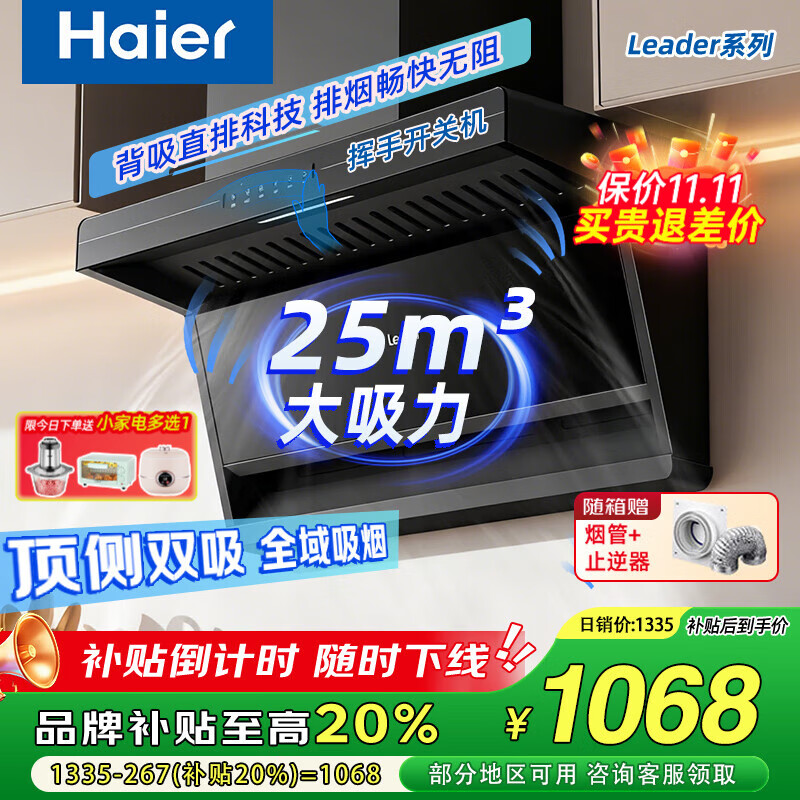 海尔【9月新品】抽油烟机顶侧双吸排抽油烟机家用25风量大吸力7字型燃气灶具套装 Leader系列 【单烟机】25m³大吸力+顶侧双吸