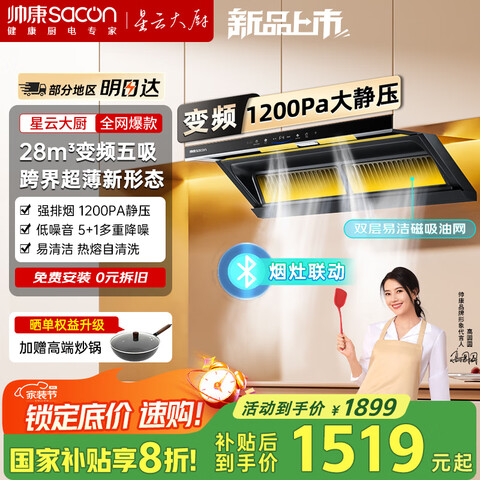 帅康(Sacon)【星云大厨】Y863变频1200pa顶侧五吸28m³抽油烟机【补贴20%】三维超薄家用自清洁燃气灶具套装【三排五腔不漏烟】Y863烟机天燃气