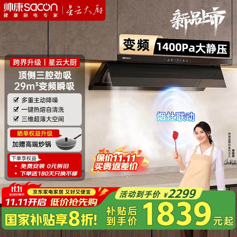 帅康(Sacon)【星云大厨】Y865/863跨界超薄顶侧双吸1400Pa抽油烟机 【补贴20%】家用自清洗大吸力燃气灶具套装 【烟灶联动】烟机+815定时灶 天燃气