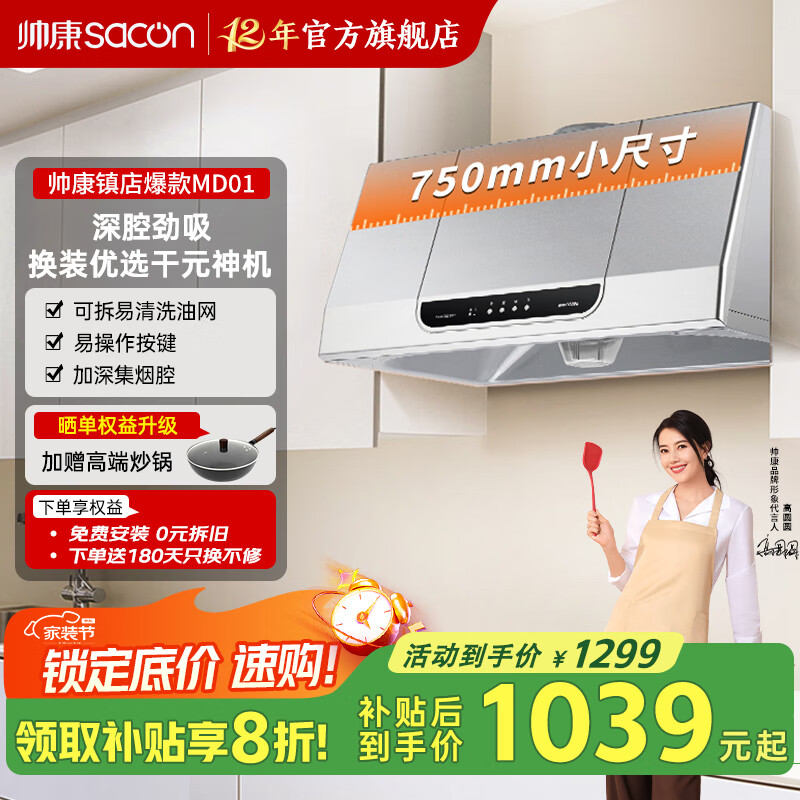 帅康(Sacon)【补贴20%】750mm小尺寸顶吸中式脱排抽油烟机MD01家用大吸力烟机 灶具套装可选 【福利三件套】搭聚能猛火灶+16L燃热 天燃气