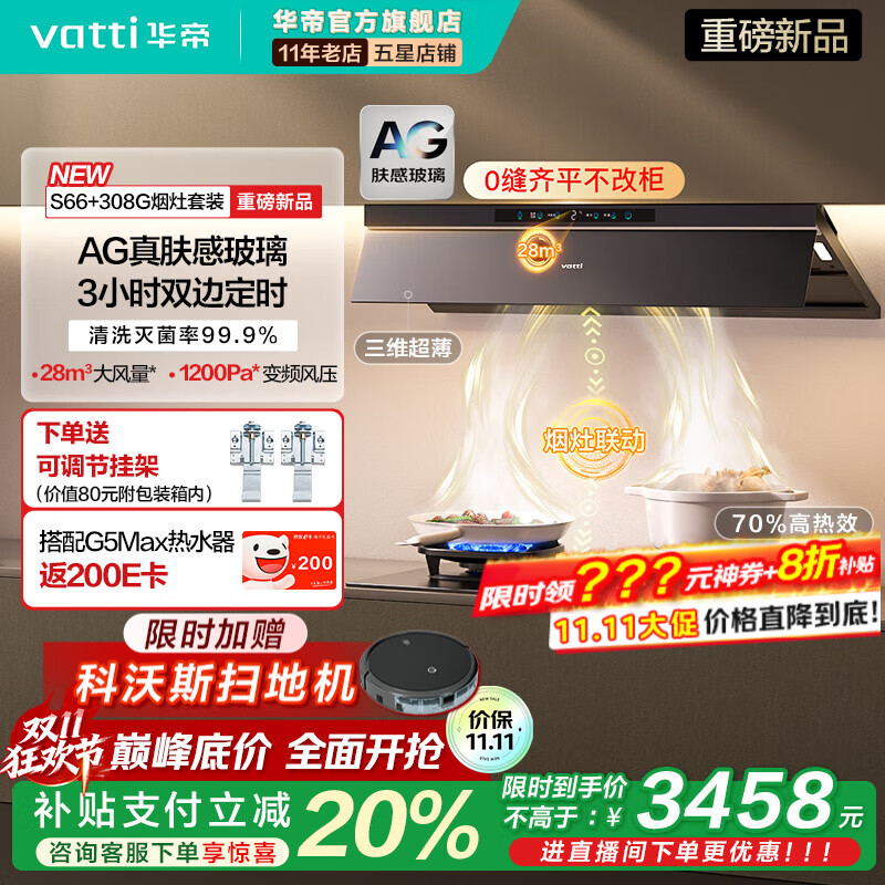 华帝(VATTI)【小飞碟Max S66】(官方补贴20%)顶侧一体28大风量一级超薄平嵌冲浪洗大吸力变频油烟机灶具套装 i11S66+308G | 3小时双边定时烟灶套装