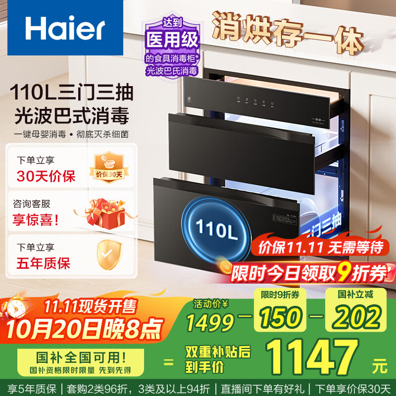 海尔(Haier)消毒柜EB031家用嵌入式 三层消毒碗柜 奶瓶消毒烘干一体机 光波巴氏消毒 母婴童锁 110L三门三抽 二星级 110L 三门三抽