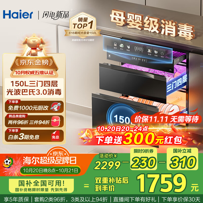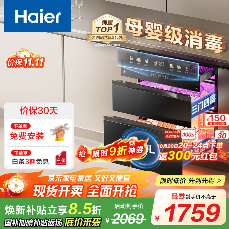 海尔【小红花套系】消毒柜EB150十口之家150L 三门四抽 嵌入式母婴消毒碗柜 碗筷消毒 消杀13种病毒 二星级 150L 嵌入式