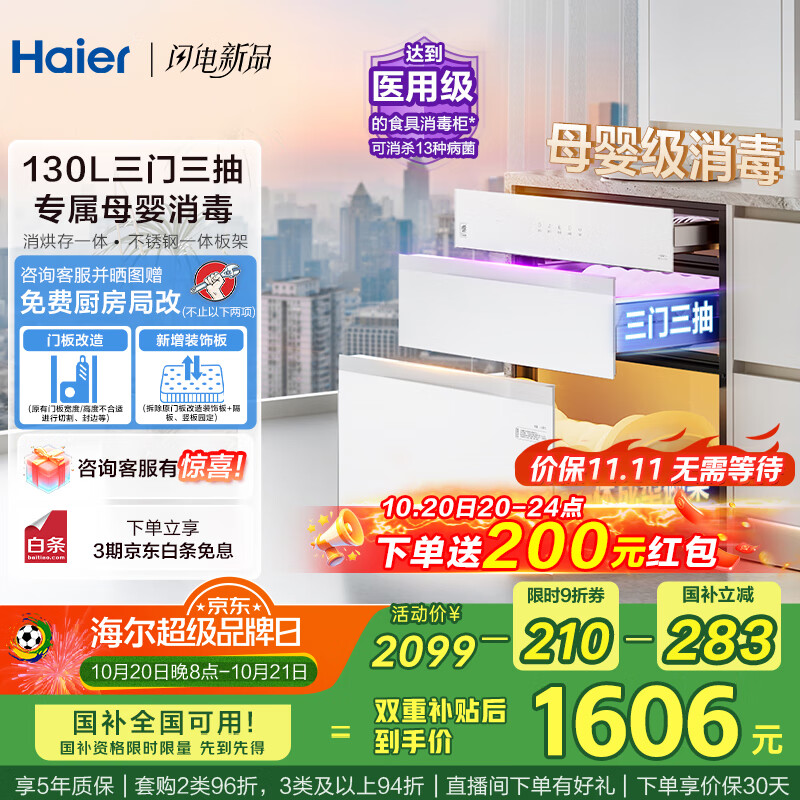海尔(Haier)130L【小红花厨电-绽放版】嵌入式消毒柜 灭菌舱系列大容量消毒柜三门三抽 白色母婴消毒柜 EB130B