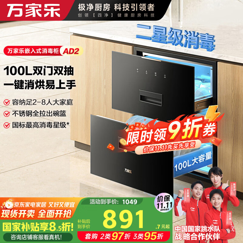 万家乐【AD2·独立操控】嵌入式消毒柜独立操控家用100L嵌入式二星级双门双抽 红外线奶瓶碗筷高温消毒柜