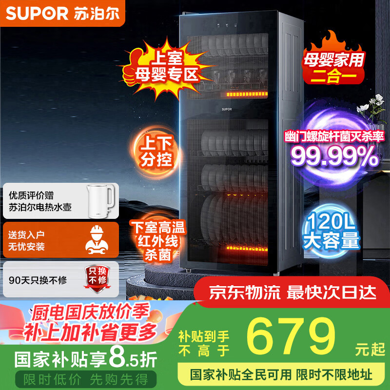 苏泊尔(SUPOR)[家电国家补贴至高15%]消毒柜立式家用容量120L430不锈钢内胆上室母婴专区紫外线杀菌RLD120-DL12