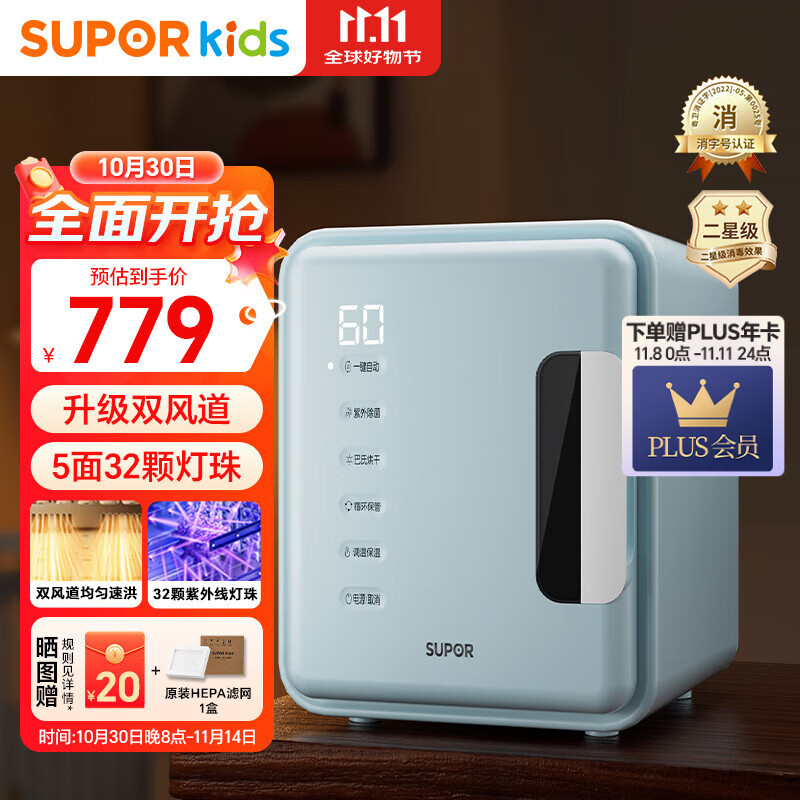 百亿补贴:苏泊尔(SUPOR)奶瓶消毒器带烘干婴儿消毒锅 无汞多功能紫外线奶瓶保洁柜XD10