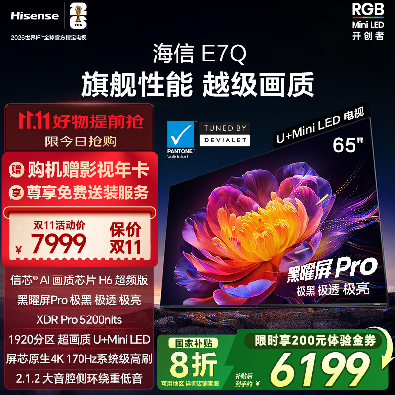 海信电视E7Q 65英寸 信芯芯片H6超频版 黑曜屏Pro XDR5200nits 1920分区 300Hz 国家补贴e7npro升级 65英寸
