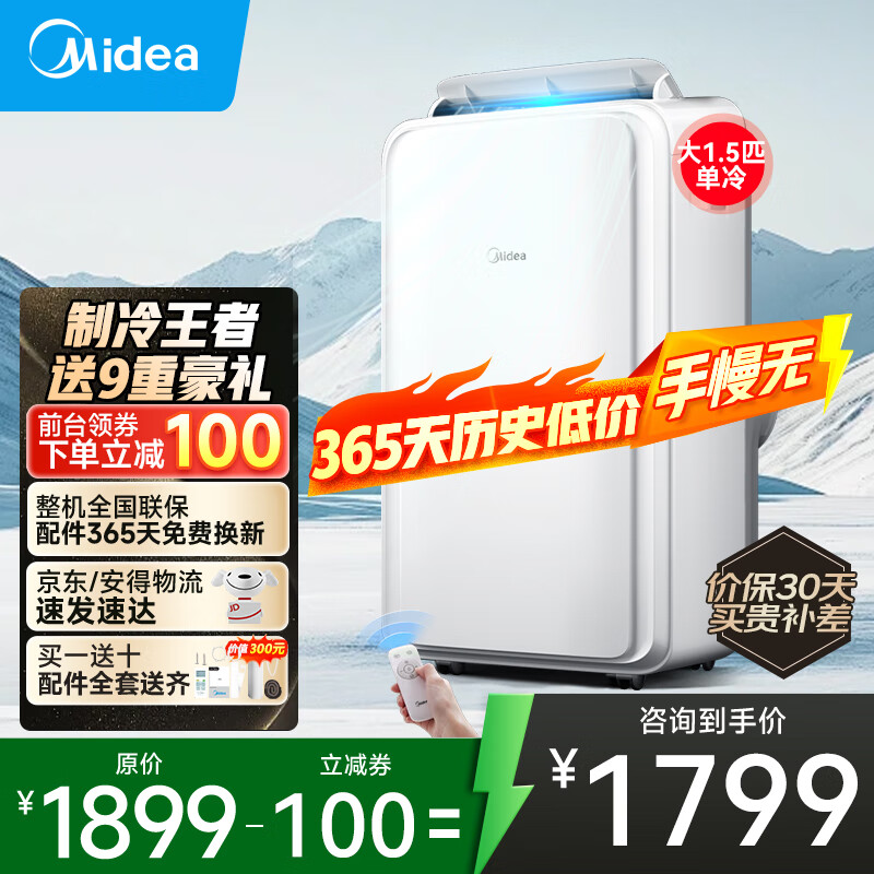 美的移动空调单冷 1匹/大1.5匹/2匹 双管家用空调一体机 租房卧室客厅宿舍 便携除湿免排水免专业安装 大1.5匹 【单冷】大冷量制冷王35PD3 商家速发