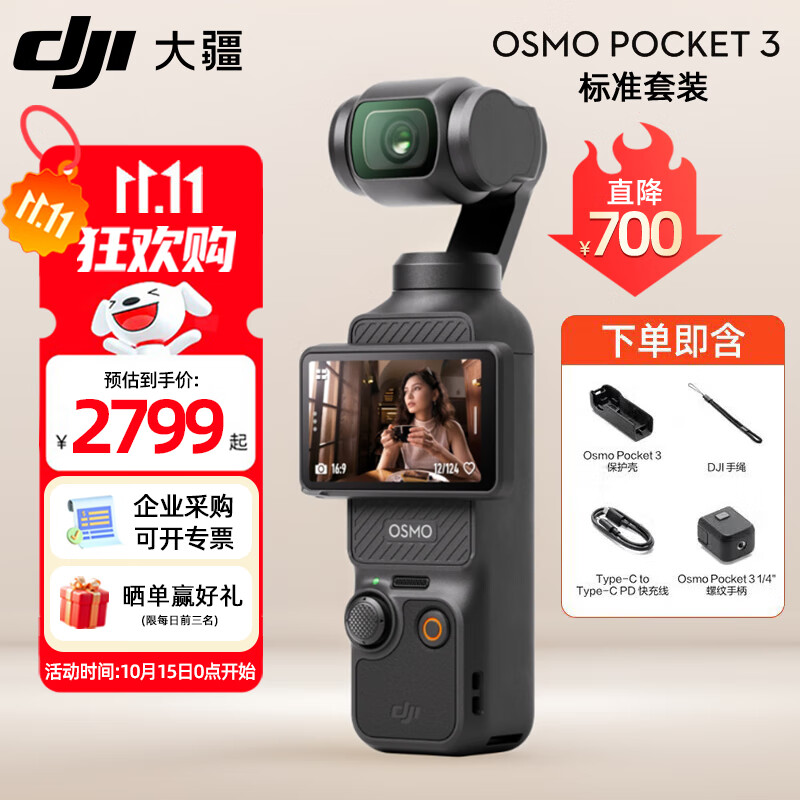 大疆(DJI)Osmo Pocket 3 一英寸口袋云台相机官方 OP 灵眸手持数码相机高清防抖 旅游vlog 便携美颜摄像机 Osmo Pocket 3 标准套装 官方标配